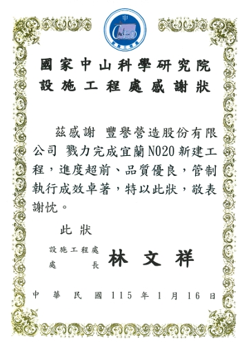 豐譽營造於2026年1月16日獲選為「優良供應商」,此一肯定反映豐譽企業團隊在工程履約、管理制度與交付品質上的長期投入。宜蘭N020 新建工程獲國家中山科學研究院(中科院)設施工程處致贈感謝狀,對本案執行表現予以正式表揚。