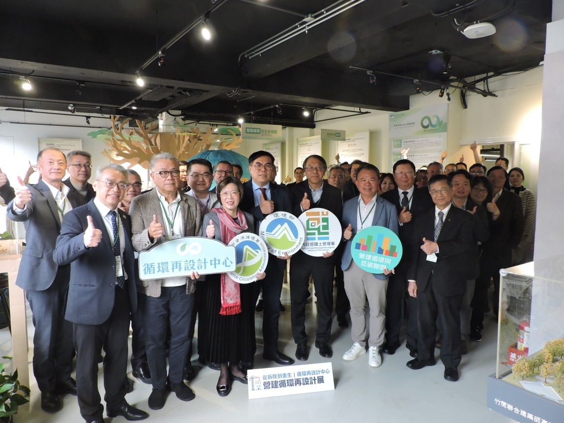 《營建循環再設計展》自 11/18 開展以來,已吸引 42 個團體觀展。今(2026/1/30)日舉辦成果交流茶會,邀請環境部彭啓明部長、資源循環署賴瑩瑩署長、內政部國土管理署歐正興主任秘書,豐譽企業團隊謝佶燁董事長,與觀展的學校、公協會、公司團體及策展廠商進行交流對談。